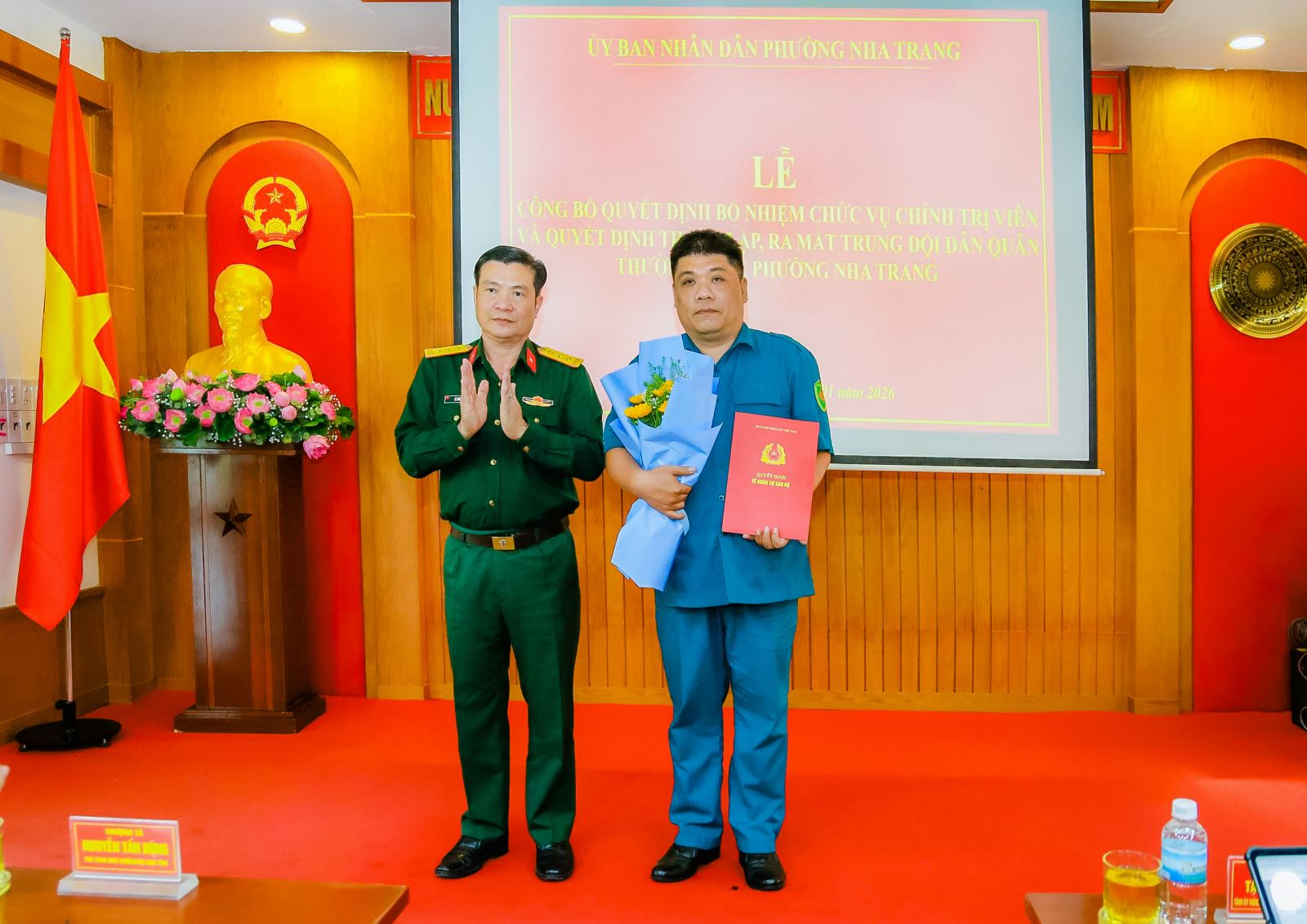 Chiều ngày 26/1/2026, UBND phường Nha Trang tổ chức lễ công bố quyết định bổ nhiệm chức vụ chính trị viên và quyết định thành lập, ra mắt Trung đội Dân quân thường trực phường. Dự buổi lễ có các đồng chí: Thượng tá Nguyễn Tấn Dũng – Phó Tham mưu trưởng Bộ Chỉ huy quân sự (CHQS) tỉnh; Thượng tá Lê Xuân Kiên – Chỉ huy trưởng Ban Chỉ huy Phòng thủ khu vực 2 - Diên Khánh; Tạ Hồng Quang – Tỉnh uỷ viên, Bí thư Đảng ủy, Chủ tịch HĐND phường; Trần Xuân Tây – Phó Bí thư Đảng uỷ, Chủ tịch UBND phường.