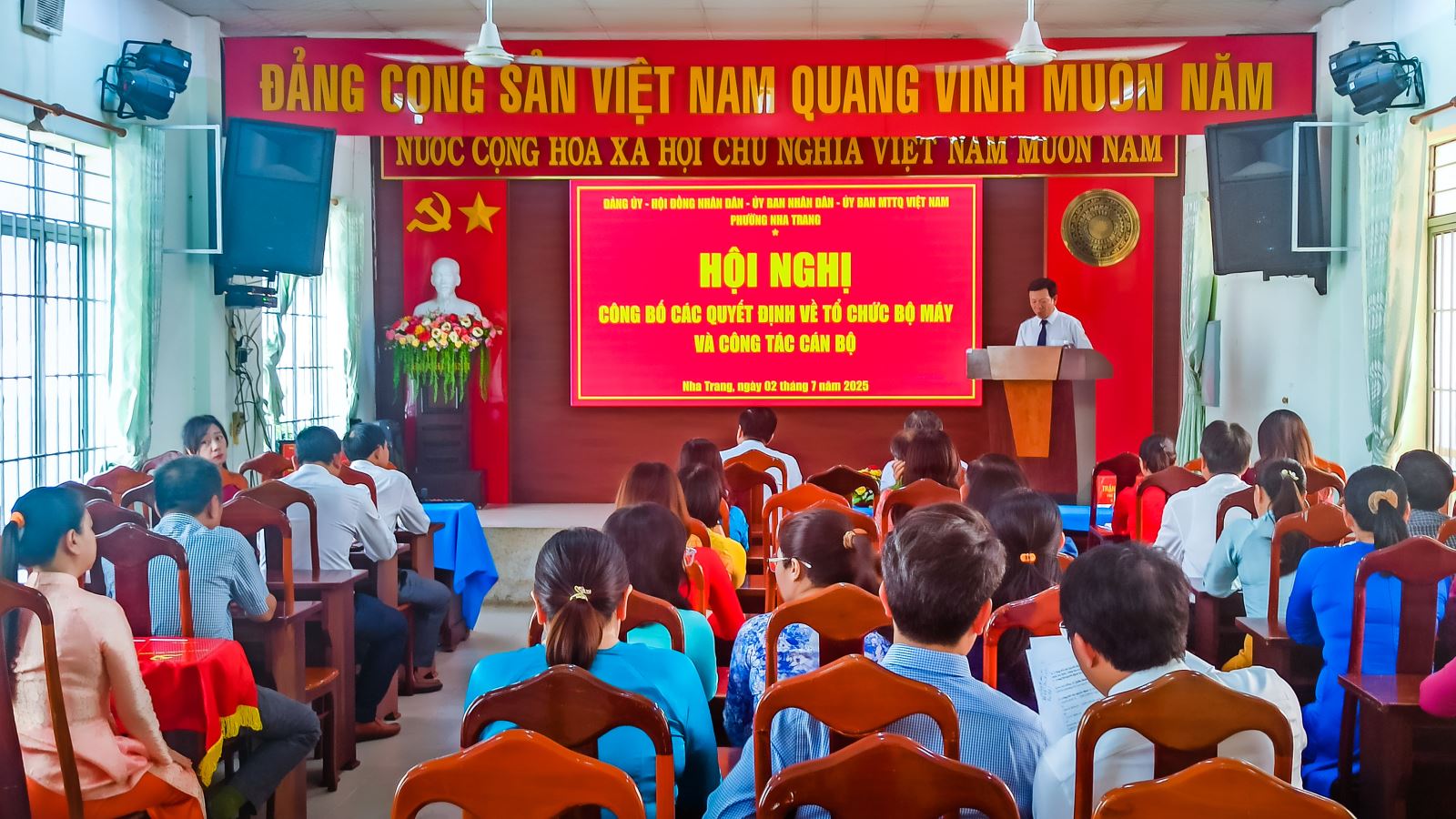 Chiều ngày 2/7/2025, Đảng ủy - HĐND - UBND - Ủy ban MTTQ Việt Nam phường Nha Trang tổ chức hội nghị công bố các quyết định về tổ chức bộ máy và công tác cán bộ. Dự hội nghị có các đồng chí: Lữ Thanh Hải - Ủy viên Ban Thường vụ Tỉnh ủy, Bí thư Đảng ủy, Chủ tịch HĐND phường Nha Trang; Lưu Thành Nhân - Phó Bí thư Thường trực, Chủ nhiệm Ủy ban kiểm tra Đảng ủy phường.