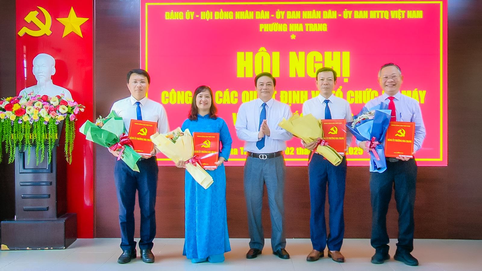 Hội nghị đã công bố các Quyết định của Tỉnh ủy Khánh Hòa: chỉ định Ban Chấp hành Đảng bộ phường Nha Trang, nhiệm kỳ 2025 - 2030 gồm 22 đồng chí; chỉ định Ban Thường vụ Đảng ủy phường gồm 8 đồng chí; chỉ định đồng chí Trần Xuân Tây - Phó Bí thư Thường trực huyện ủy Cam Lâm và đồng chí Lưu Thành Nhân, Thành ủy viên, Phó Chủ tịch UBND TP. Nha Trang giữ chức vụ Phó Bí thư Đảng ủy phường nhiệm kỳ 2025 - 2030; chỉ định Ủy ban Kiểm tra Đảng ủy phường Nha Trang nhiệm kỳ 2025 - 2030 gồm 5 đồng chí, trong đó đồng chí Lưu Thành Nhân - Phó Bí thư Thường trực Đảng ủy phường được chỉ định giữ chức vụ Chủ nhiệm Ủy ban Kiểm tra Đảng ủy phường nhiệm kỳ 2025 - 2030; chỉ định đồng chí Nguyễn Phan Trang Thanh, Ủy viên Ban Chấp hành Đảng bộ phường giữ chức vụ Phó Chủ nhiệm Ủy ban Kiểm tra Đảng ủy phường nhiệm kỳ 2025 - 2030. Hội nghị đồng thời công bố Quyết định của Ủy ban MTTQ Việt Nam tỉnh công nhận 168 ông (bà) là Ủy viên Ủy ban MTTQ Việt Nam phường và công nhận các chức danh trong Ban Thường trực Ủy ban MTTQ Việt Nam phường Nha Trang, nhiệm kỳ 2024 - 2029 gồm 5 đồng chí, trong đó bà Nguyễn Thị Phương Duyên là Chủ tịch Ủy ban MTTQ Việt Nam phường, bà Nguyễn Thị Khánh Ly là Phó Chủ tịch Ủy ban MTTQ Việt Nam phường kiêm Chủ tịch Hội Liên hiệp phụ nữ phường, bà Lê Nguyễn Thái Minh là Phó Chủ tịch Ủy ban MTTQ Việt Nam phường kiêm Bí thư Đoàn TNCSHCM phường, ông Nguyễn Minh Hùng là Phó Chủ tịch Ủy ban MTTQ Việt Nam phường kiêm Chủ tịch Hội Cựu chiến binh phường, bà Phạm Thị Thúy Phương là Phó Chủ tịch Ủy ban MTTQ Việt Nam phường kiêm Chủ tịch Công đoàn phường.