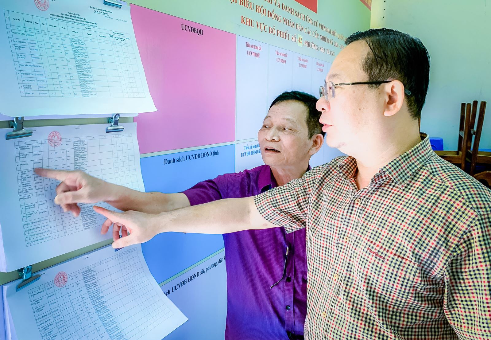 Đồng chí Lưu Thành Nhân – Phó Bí thư Thường trực Đảng uỷ phường kiểm tra việc niêm yết danh sách cử tri tại khu vực bỏ phiếu số 42 – Tổ dân phố Trường Sơn