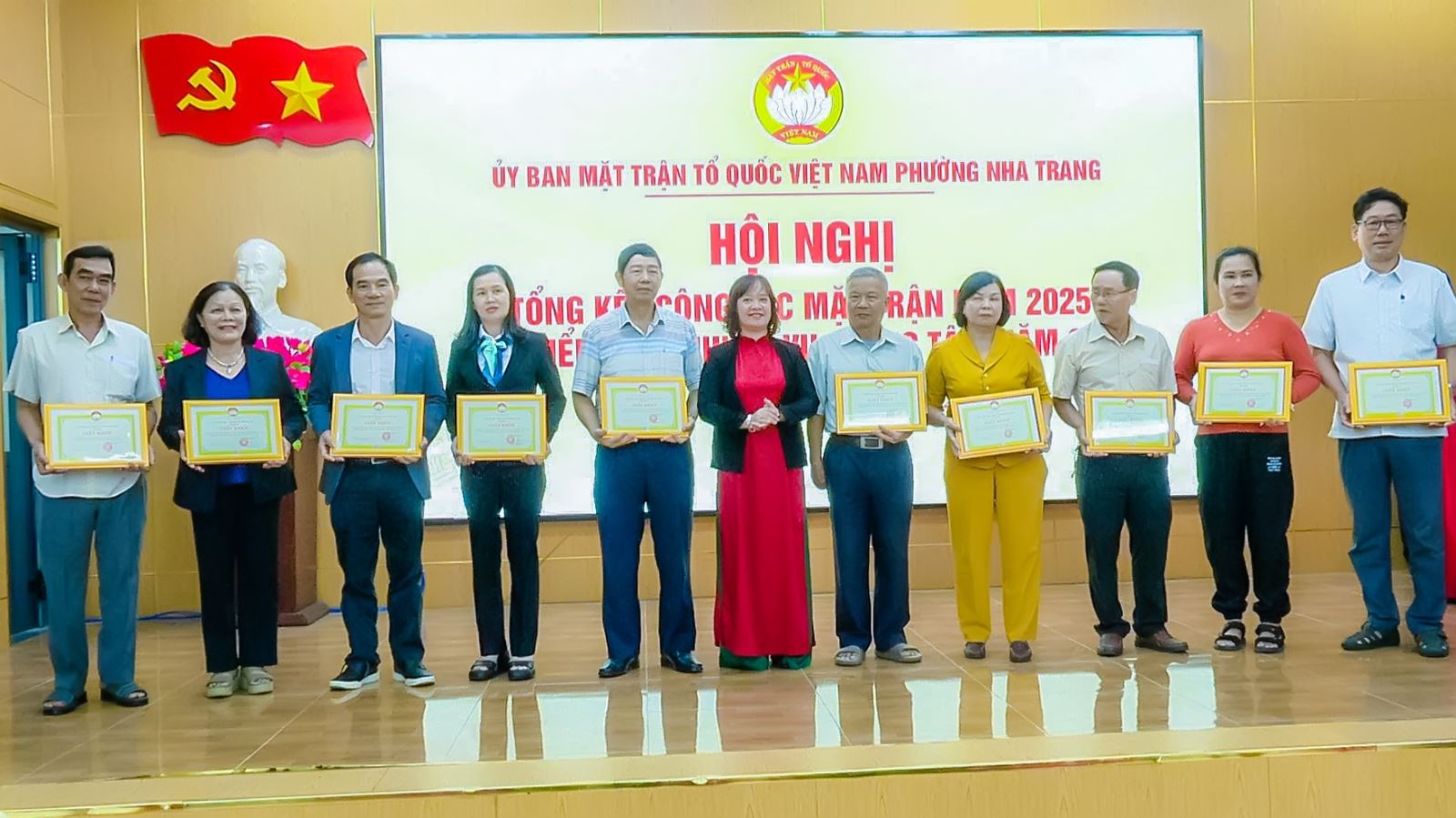 Dịp này, UBMTTQ Việt Nam phường Nha Trang đã tặng giấy khen cho 19 tập thể, 21 cá nhân; biểu dương 5 tập thể, 11 cá nhân đạt nhiều thành tích xuất sắc trong công tác mặt trận năm 2025. Đồng thời khen thưởng 10 tập thể, 20 cá nhân đã có thành tích xuất sắc tiêu biểu trong công tác tuyên truyền, vận động, ủng hộ Nhân dân khắc phục hậu quả thiên tai, bão lũ 2025.