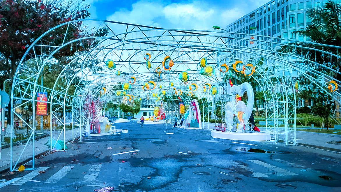 Ngay từ lối vào, cổng chào Hội Hoa Xuân 2026 trên trục đường Trần Phú được thiết kế công phu, mang tính biểu tượng cao, tạo ấn tượng mạnh với người dân và du khách. Ý tưởng chủ đạo kết hợp giữa hình ảnh sóng biển Nha Trang, hoa mai vàng truyền thống và linh vật Ngựa mỹ thuật độc đáo năm Bính Ngọ, thể hiện sự giao hòa giữa thiên nhiên biển đảo và không khí Tết cổ truyền. Gam màu đỏ - vàng chủ đạo tượng trưng cho may mắn, thịnh vượng, kết hợp hệ thống đèn LED nghệ thuật giúp không gian bừng sáng cả ngày lẫn đêm. Các chi tiết trang trí mềm mại, cách điệu theo hình cánh hoa, con sóng, vừa hiện đại vừa gần gũi, tạo nên điểm check-in nổi bật cho du khách khi đến tham quan, chụp ảnh lưu niệm.