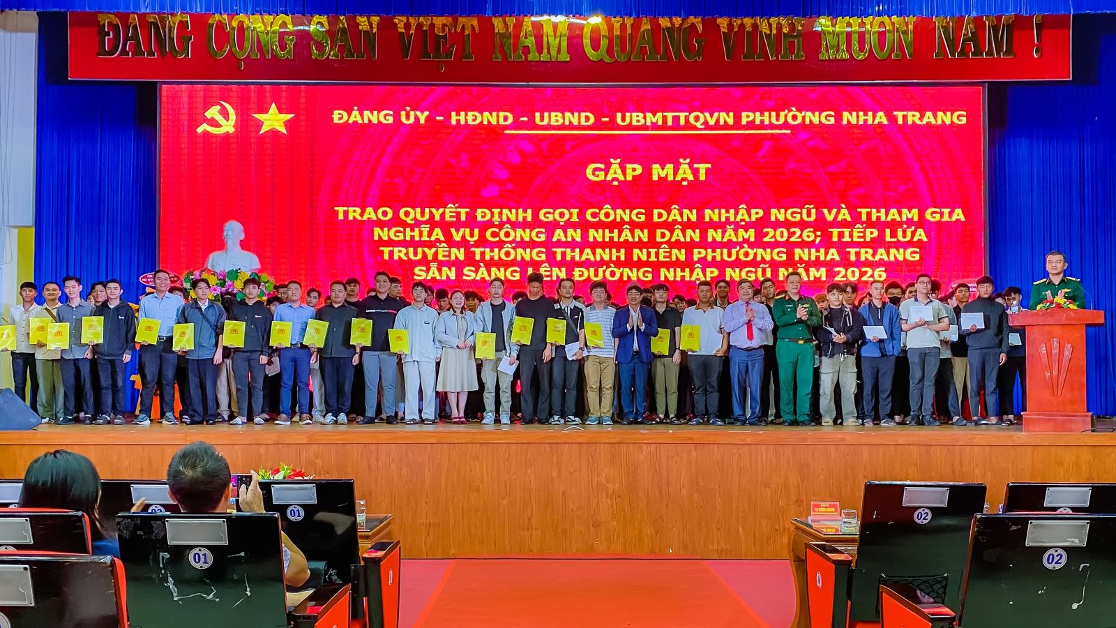 Chiều ngày 10/2/2026, Đảng ủy - HĐND - UBND - Ủy ban Mặt trận TQVN phường Nha Trang tổ chức buổi gặp mặt trao quyết định gọi công dân nhập ngũ và thực hiện nghĩa vụ tham gia công an nhân dân, tiếp lửa truyền thống thanh niên lên đường nhập ngũ năm 2026. Dự buổi gặp mặt có các đồng chí: Tạ Hồng Quang - Tỉnh ủy viên, Bí thư Đảng ủy, Chủ tịch HĐND phường; Trần Xuân Tây - Phó Bí thư Đảng ủy, Chủ tịch UBND, Chủ tịch Hội đồng nghĩa vụ quân sự phường; cùng lãnh đạo Ban Chỉ huy quân sự (CHQS), Công an phường; Bí thư, Tổ trưởng các Tổ dân phố trên địa bàn.