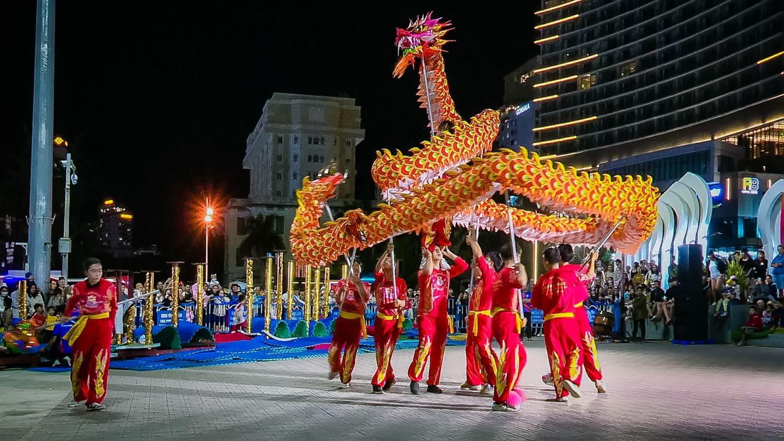 Đêm diễn đã mang đến cho đông đảo người dân và du khách 13 tiết mục biểu diễn sôi nổi, hấp dẫn và đẹp mắt như: tứ lân tranh hùng; mãnh long vượt núi hái linh chi; huyết long một vòng Việt Nam; song sư lâm môn; biểu diễn võ cổ truyền; lân sư rồng giao hội mừng xuân; rồng thăng thiên đón năm mới... cùng các tiết mục ca nhạc sôi động của ca sĩ YONGDY.