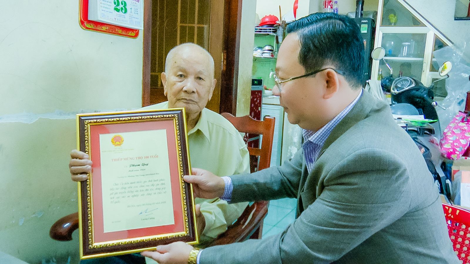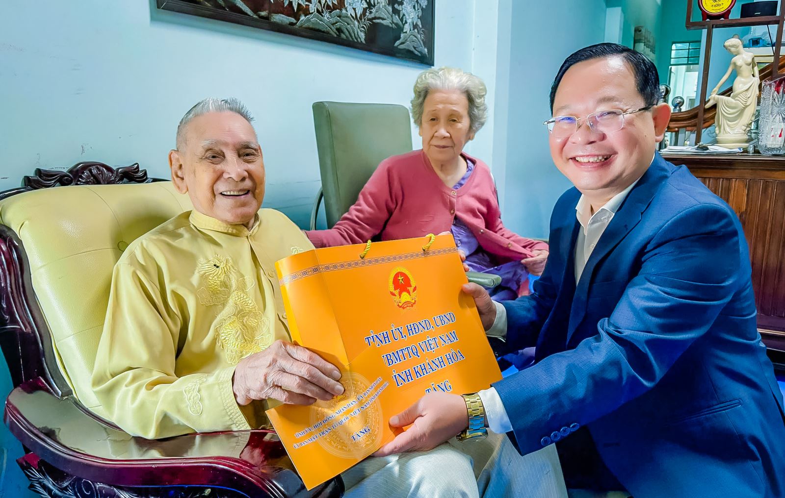 Các đồng chí cùng gửi lời thăm hỏi sức khỏe, cuộc sống thường ngày của các cụ tròn 100 tuổi, bày tỏ sự trân trọng đối với những đóng góp, cống hiến của các cụ cho gia đình và xã hội. Nhân dịp này, các đồng chí lãnh đạo phường Nha Trang đã trao Thiếp mừng thọ của Chủ tịch nước, cùng phần quà gồm 5 mét vải lụa và 1 triệu đồng tiền mặt cho mỗi cụ, chúc các cụ và gia đình nhiều sức khoẻ, đón năm mới Bính Ngọ 2026 an khang, thịnh vượng.
