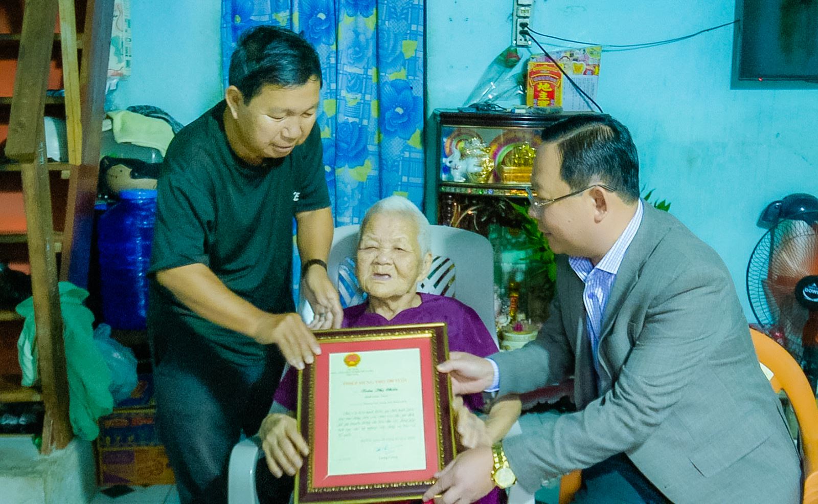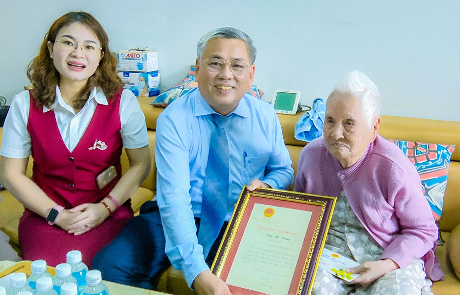 Đồng chí Lê Tiến Vĩnh - phó Chủ tịch UBND phường trao Thiếp mừng thọ và chúc Tết cụ Võ Thị Trang tròn 100 tuổi