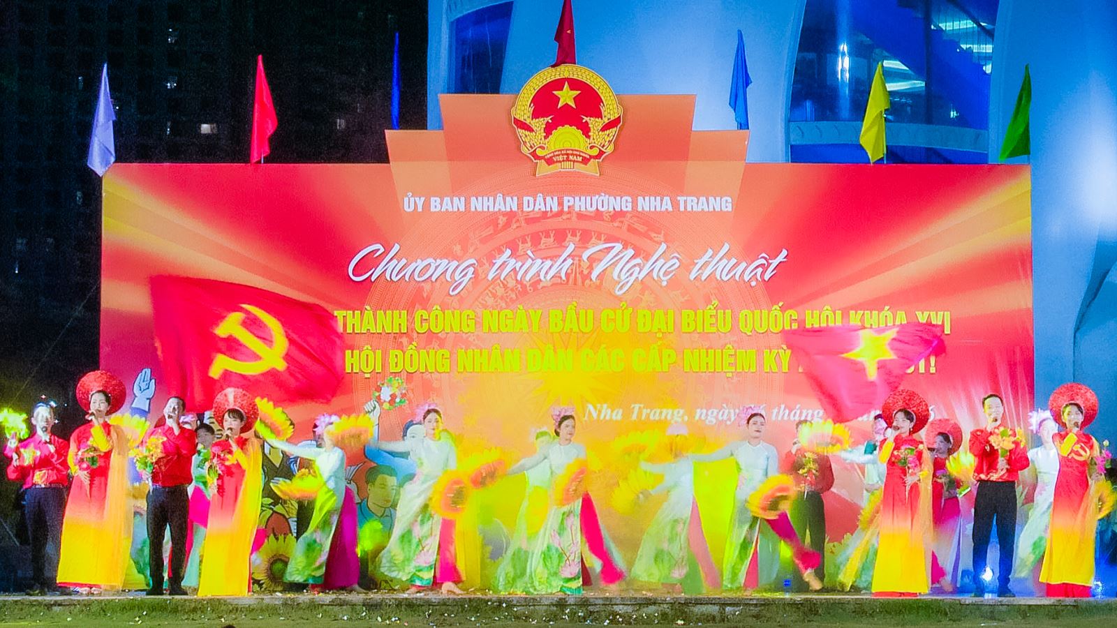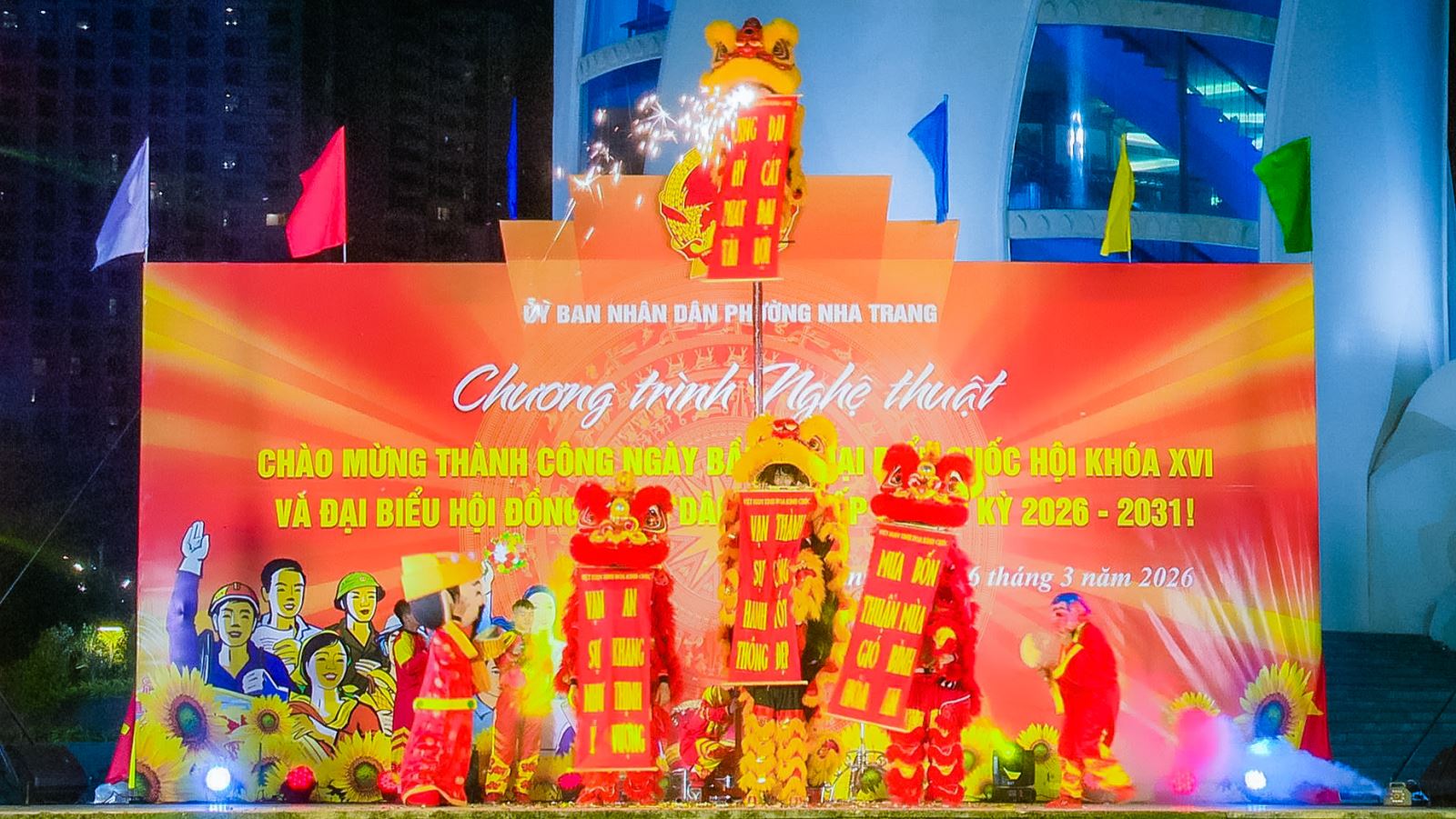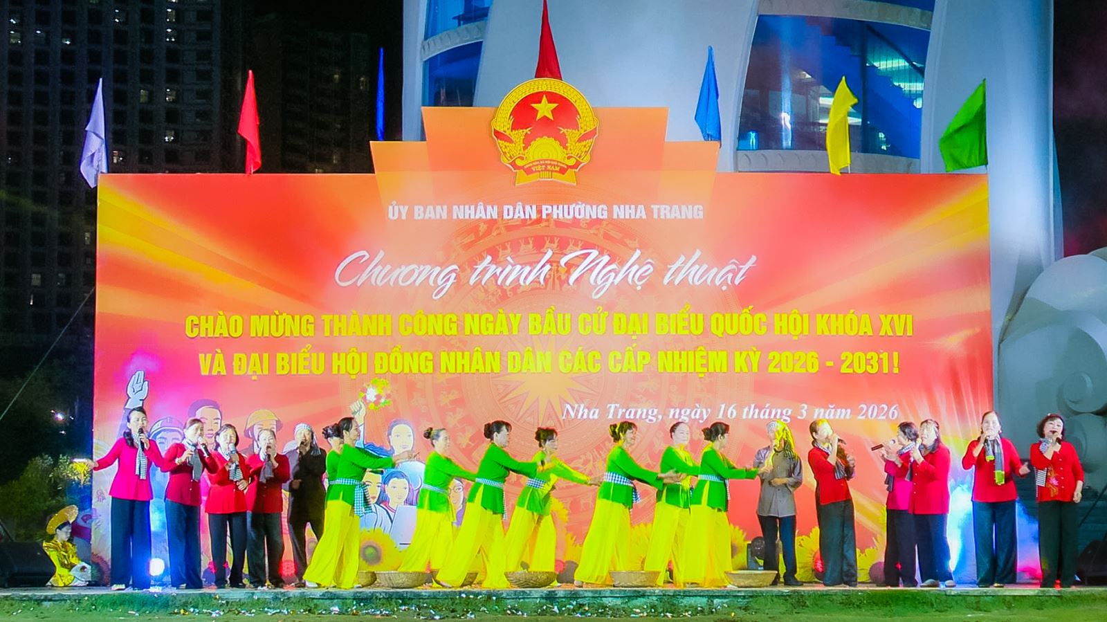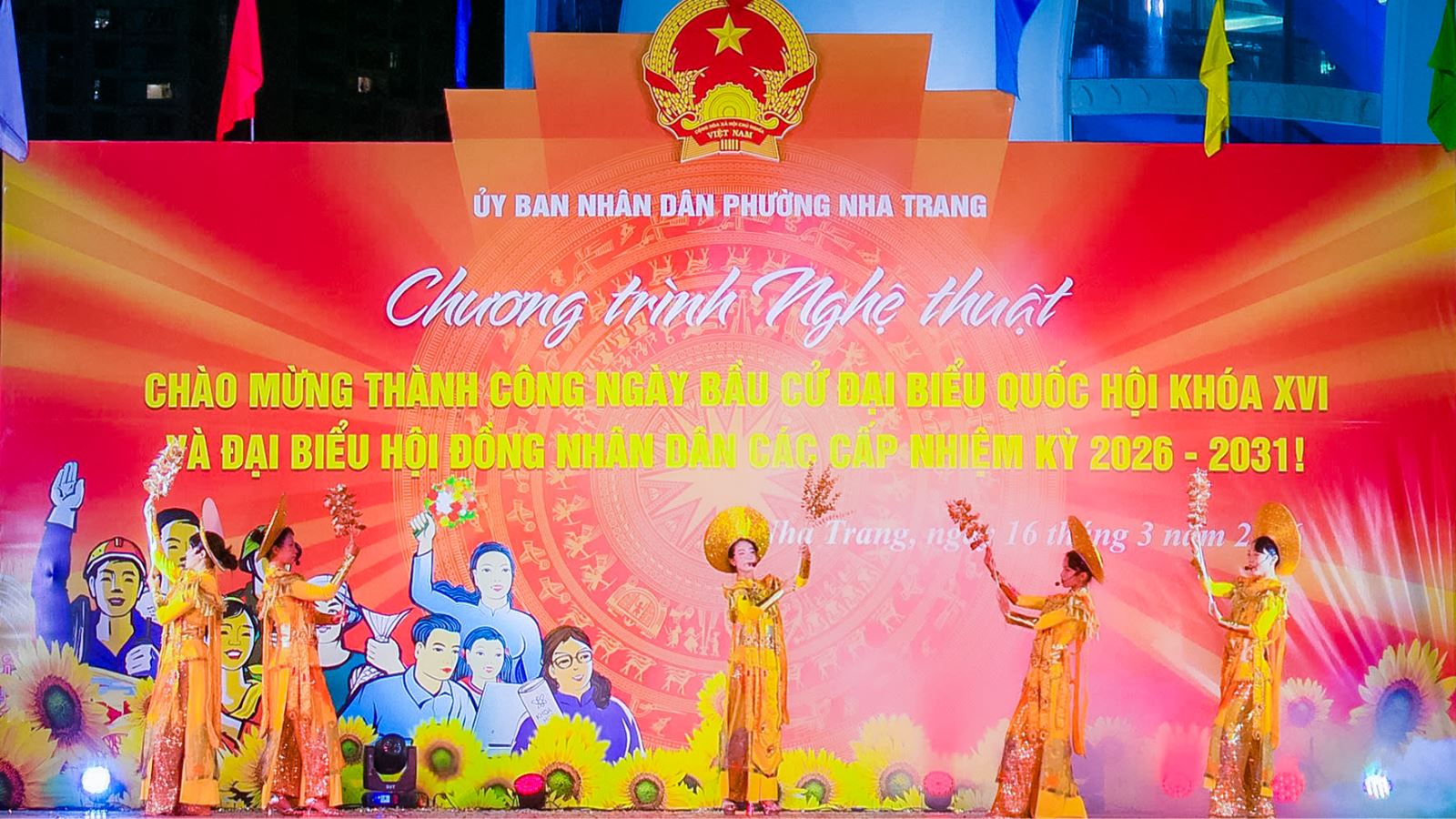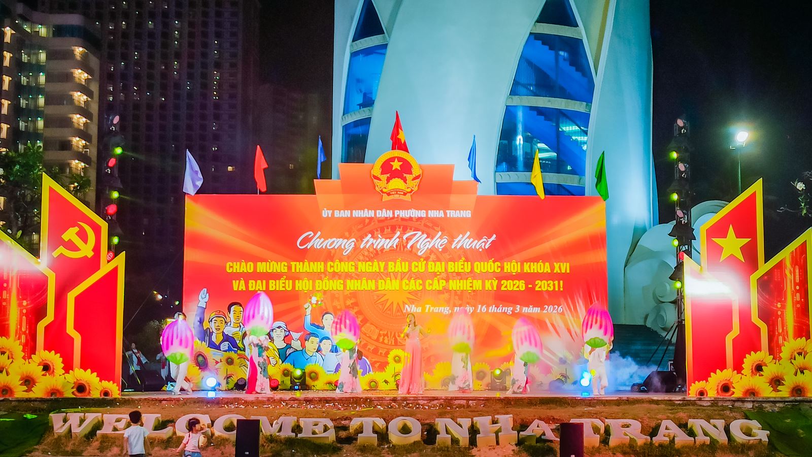 Tối ngày 16/3, tại Quảng trường 2 tháng 4, UBND phường Nha Trang đã tổ chức chương trình nghệ thuật chào mừng thành công cuộc bầu cử đại biểu Quốc hội khóa XVI và đại biểu HĐND các cấp nhiệm kỳ 2026–2031. Dự chương trình có ông Huỳnh Quang Tú - phó Chủ tịch UBND phường, cùng đông đảo cán bộ, nhân dân và du khách đến xem trong không khí vui tươi, phấn khởi.
