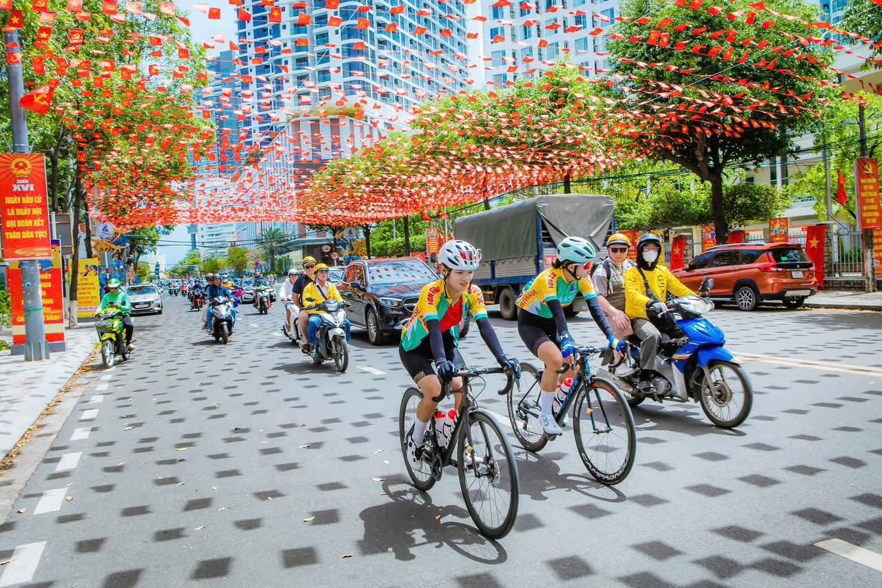 Lực lượng dân quân tự vệ phường Nha Trang đạp xe tuyên truyền hướng về ngày hội non sông.